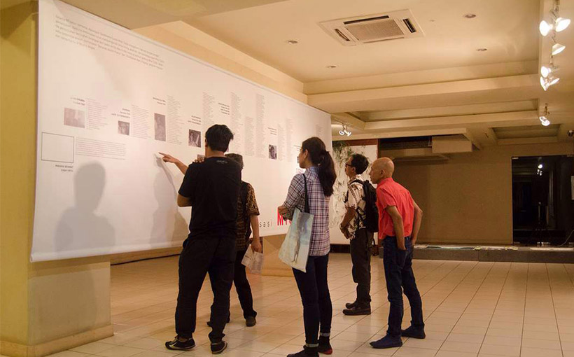Dari pintu masuk Galeri Cipta, kita bisa mengisi buku tamu dan memulainya dari kanan—sebenarnya, kita bisa memulainya dari sudut mana saja. Di sana—seperti yang saya ceritakan di awal—sebentang banner bercokol di dinding. Kita akan melihat potongan-potongan buku dan surat kabar hasil cetak digital. Kita akan melihat sebuah potongan berita dengan judul “slamatan Javastaal stokvis” dari majalah Java Bode, 21 Januari 1950. Koran itu memberitakan mengenai selamatan di Gedung Miss Tjitjih Kramat (sebutan kelompok ini saat mereka pentas di Kramat Munde Senen, Jakarta Pusat). Perusahaan Dagang Transnasional Javastaal Stokvis mengadakan selamatan itu dalam rangka nasionalisasi perusahaan dari tangan kolonial ke tangan Indonesia.