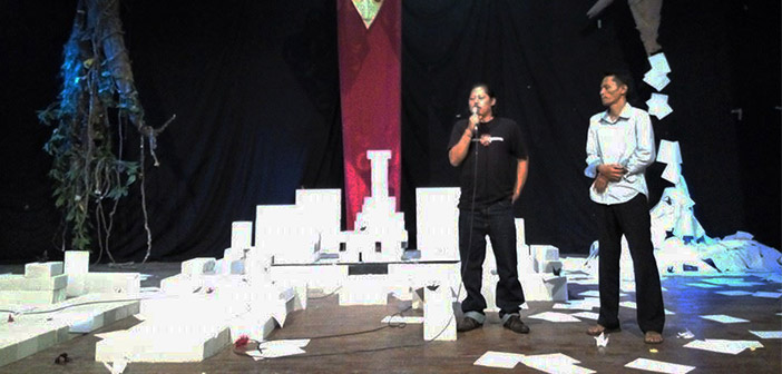 Berbeda dengan peluncuran buku puisi pada umumnya, peluncuran buku puisi di perguruan tinggi seni tersebut dikemas dalam acara yang nyaris teatrikal: panggung dihiasi instalasi berupa kuburan dan pohon terbalik, kertas-kertas berserakan, juga bau dupa yang memenuhi ruangan; Semi Ikra Anggara dan Hani Fathi Ramadhan yang tampil sebagai pembawa acara berperan sebagai Baridin dan Suratminah (aku dan kau lirik dalam puisi Riki Dhamparan).