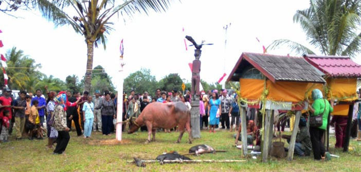 Setelah selesai berdoa, tokoh masyarakat yang dituakan mengelilingi binatang kurban dengan tarian perlahan dan teriakan spontan lengkap dengan iringan tabuhan gamelan. Formasi gamelan yang digunakan mirip dengan yang formasi gamelan standar di Pulau Jawa. Tak lama setelah itu binatang kurban mulai disembelih dari babi hingga kerbau, terus terang saya tak sempat melihat prosesi penyembelihan kerbau karena tidak kuat.