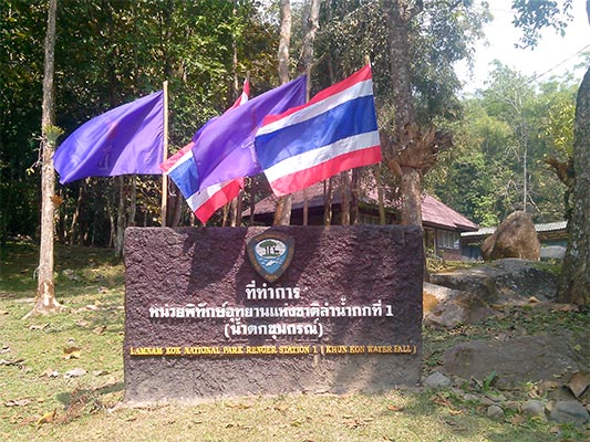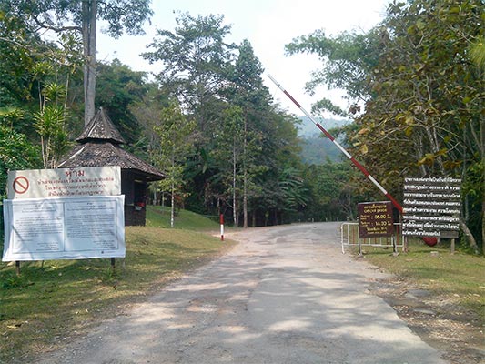 Perkiraan saya tidak salah, saya melewati Singha Park jam sepuluh kurang lima. Si Jalu terus saya geber hingga akhirnya menemukan plang Khun Korn Waterfall di sebelah kiri. Dari sana diperlukan waktu sekitar 45 menit untuk mencapai pintu masuk Taman Nasional Khun Korn. Pahamlah saya kalau air terjun yang sedang saya tuju itu berada di dalam kawasan taman nasional.