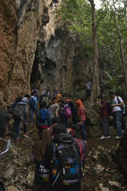 Peserta outing antri masuk Mulut Gua Pawon. (Foto: Ariq Rahadian)