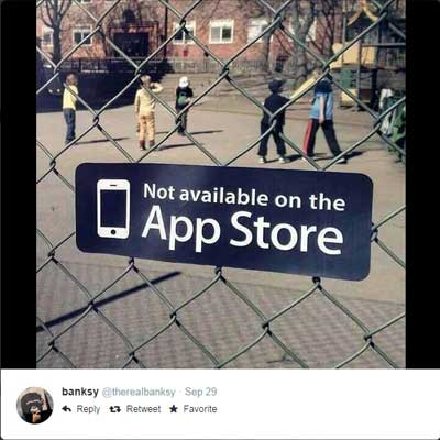 Sebelumnya saya terinterupsi oleh sebuah gambar yang diposting oleh Bansky, seniman grafiti Inggris, dalam akun twitter-nya @therealbanksy. Dia nge-twit potret suasana sebuah lapang berjaring, dimana di dalam lapang tersebut anak-anak sedang riang bermain. Pada jaring itu Banksy dengan isengnya menempelkan stiker bertuliskan “Not available on the App Store”.
