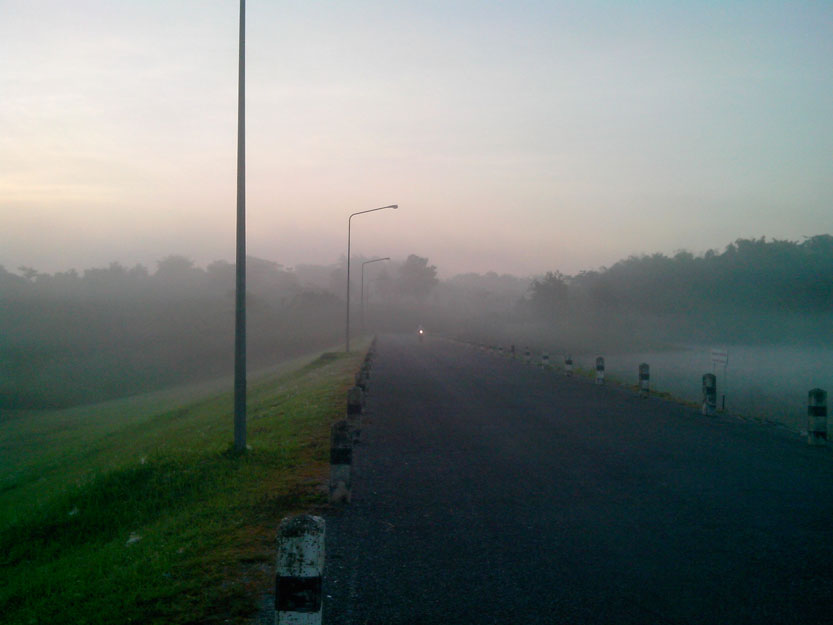 Sekitar jam enam, dari asrama saya kayuh si Jalu keluar kampus Mae Fah Luang lewat gerbang belakang, melintasi dam (mungkin tempat penampungan air), menyusuri jalan yang agak naik dan turun, tiba di persimpangan dan berbelok ke kanan, melewati jalan kampung, lalu menemukan persimpangan yang menghubungkan jalan kampung dengan jalan utama, kembali berbelok ke kanan untuk kemudian menuju asrama melalui gerbang depan kampus, dan begitulah cara saya mengawali hari.